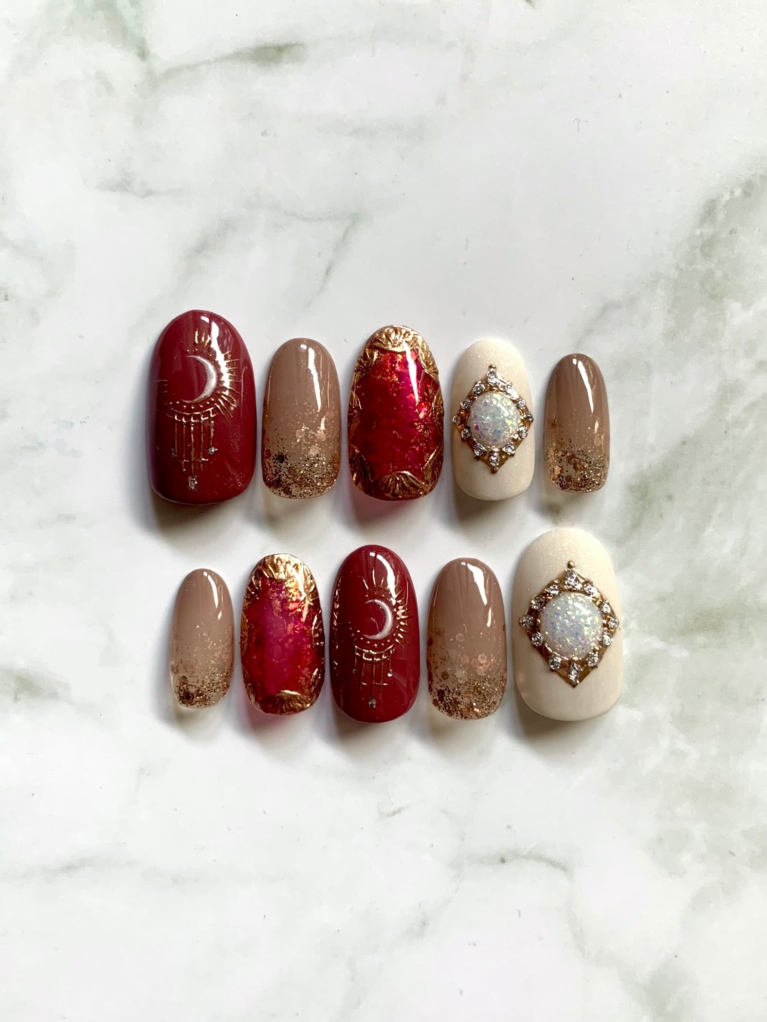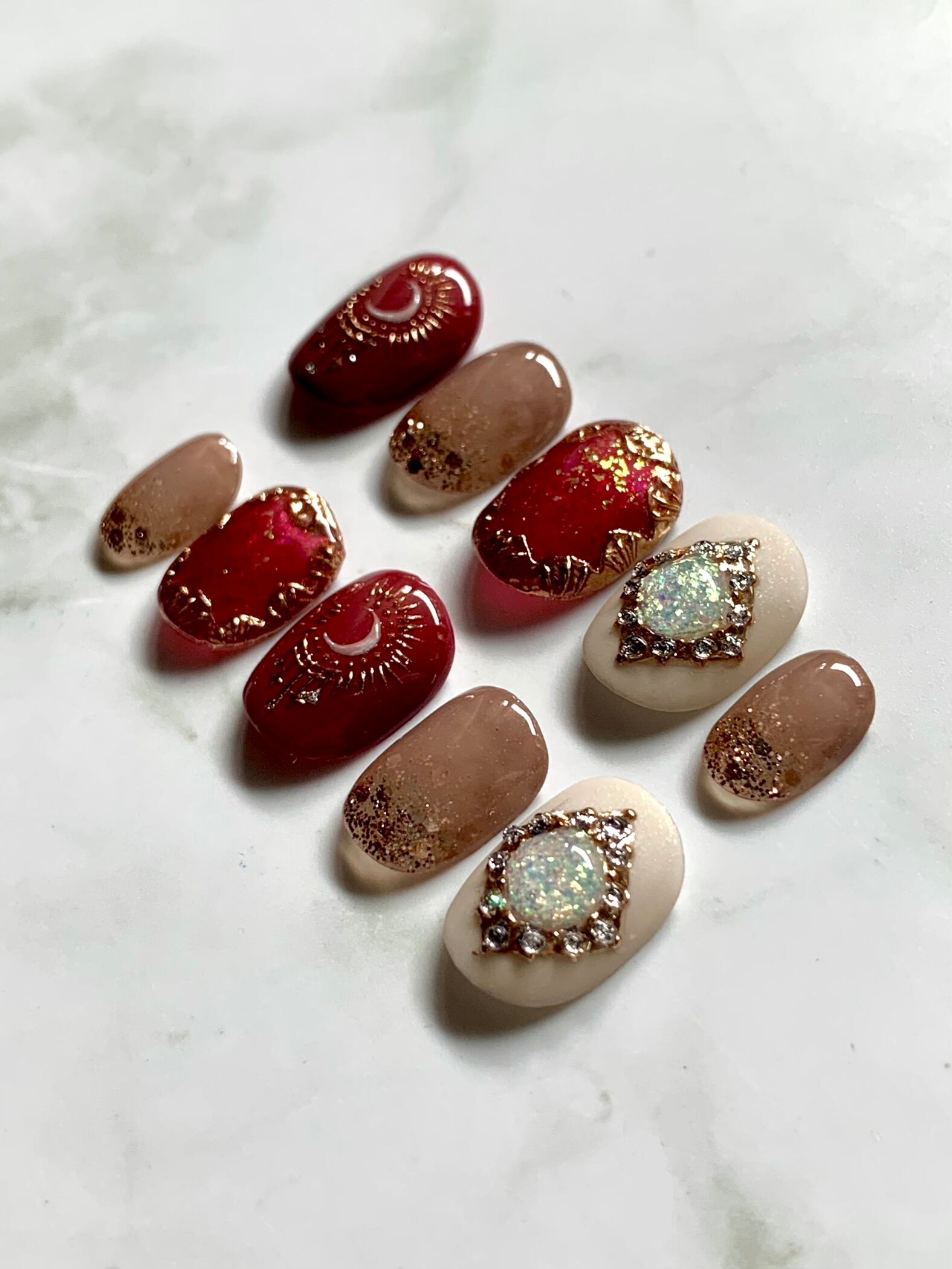 大人っぽいボルドーカラーに合わせた月のアートと薬指のジュエリーリングのデザインが