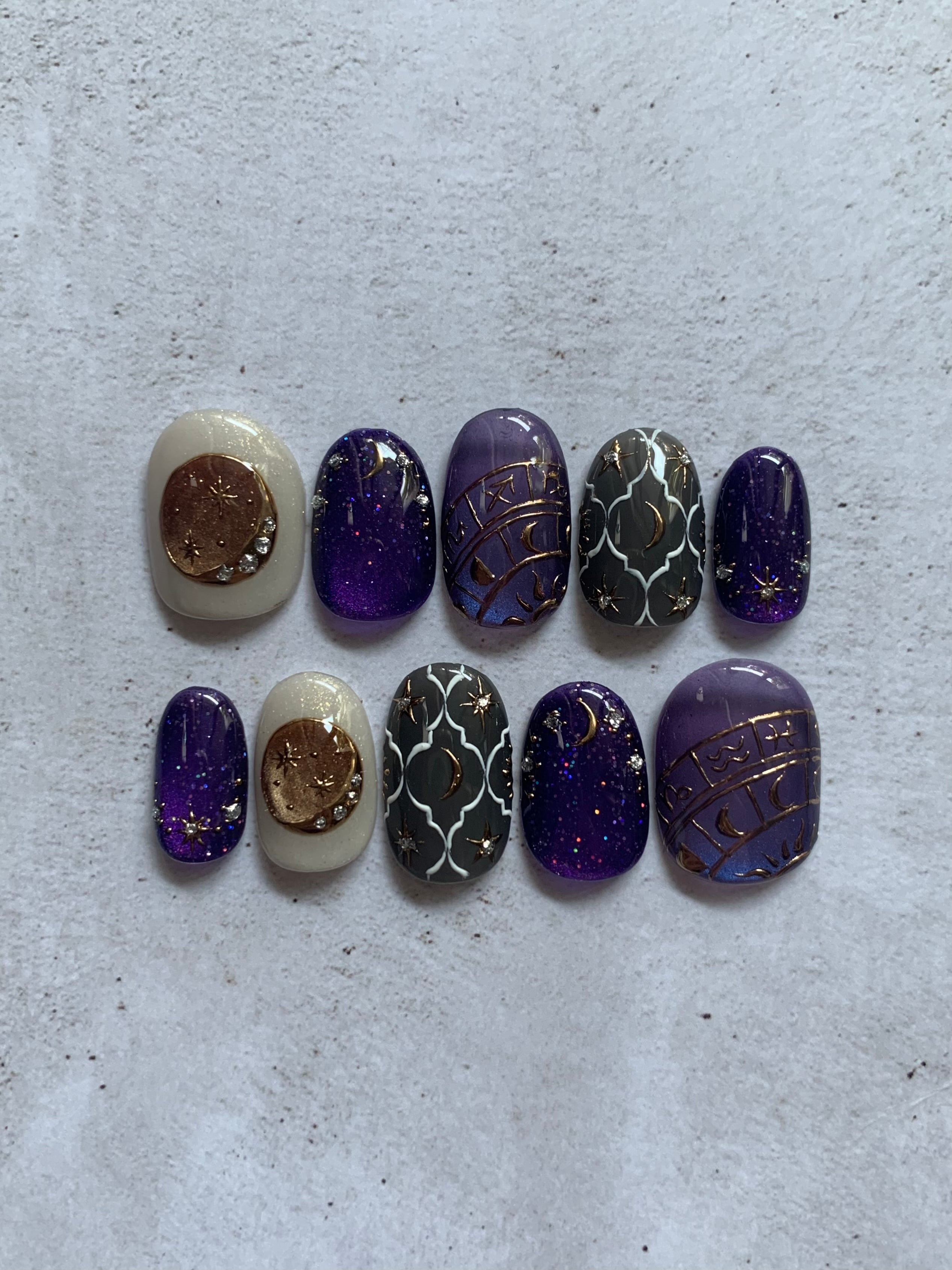 月のジュエリーアートと天球図、夜空のようなマグネットネイルを合わせた、