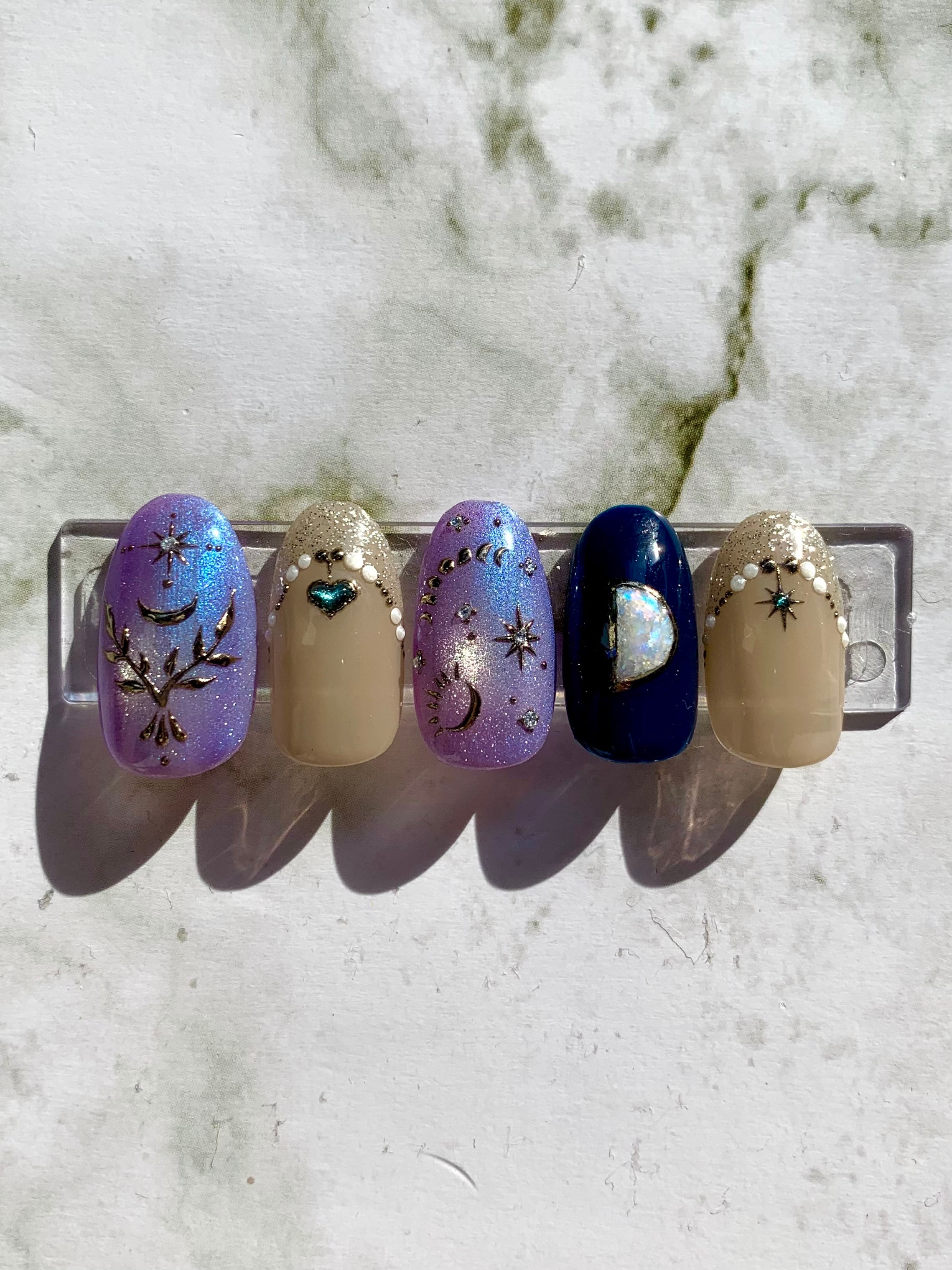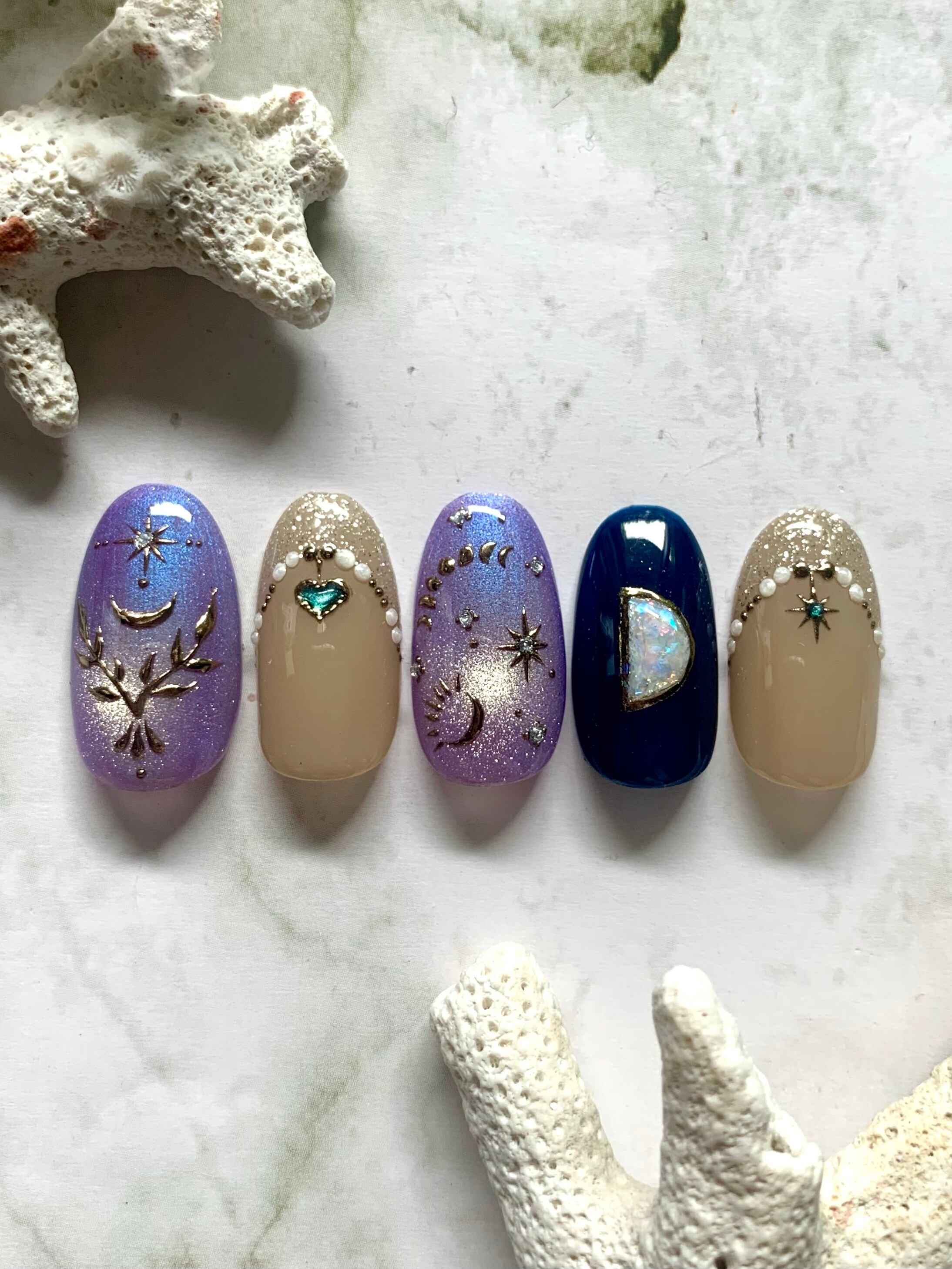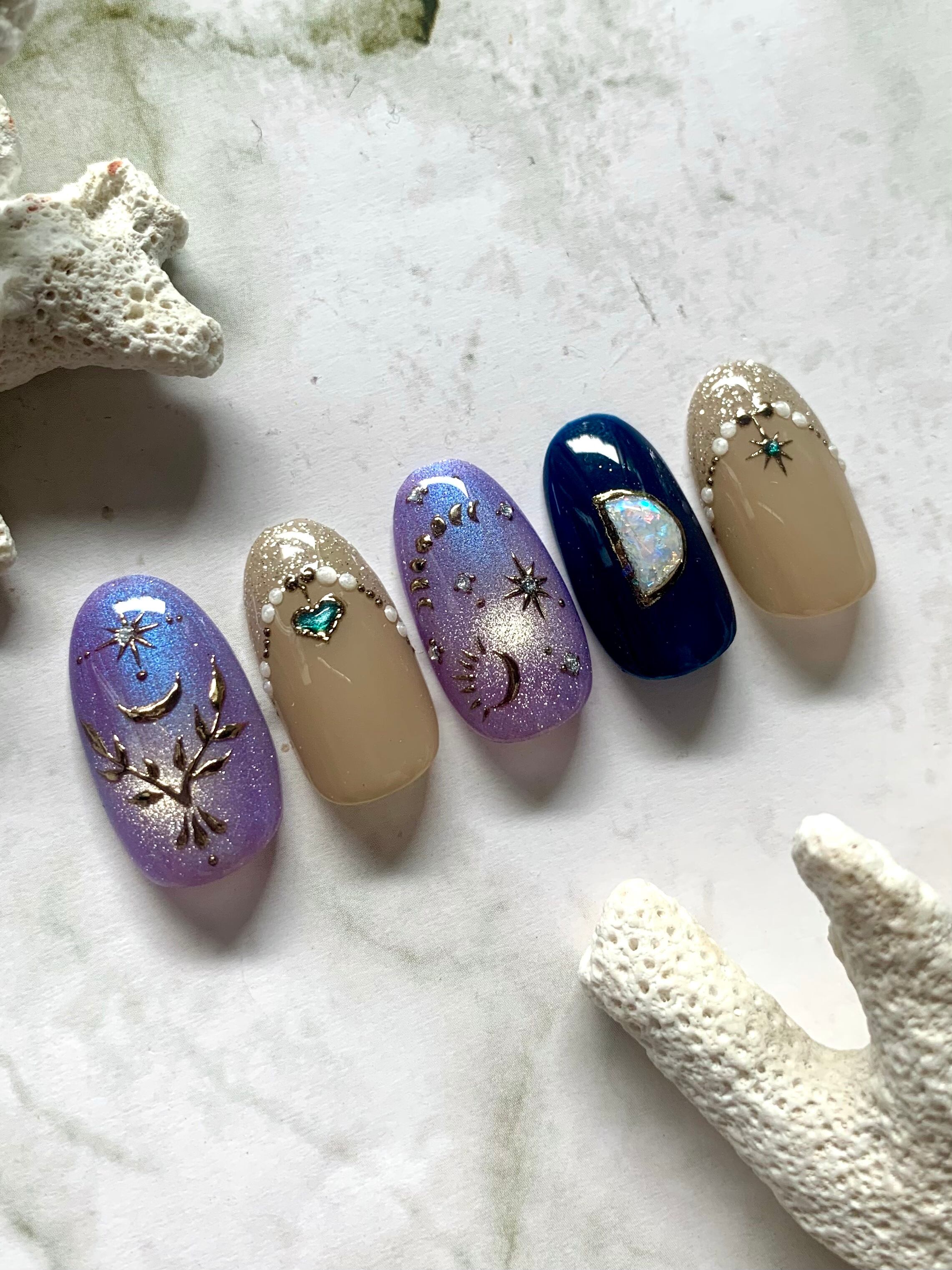 きれいなパープル×ブルーのマグネットネイルと月のアート、月型のオパールストーンを描いたデザイン☾
